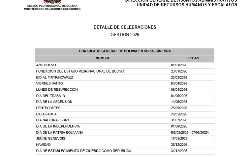 El Consulado General del Estado Plurinacional de Bolivia en Ginebra pone en conocimiento de la comunidad boliviana residente en Suiza y del público en general el calendario de feriados correspondientes a la gestión 2026, durante los cuales esta Oficina Consular no prestará atención al público.