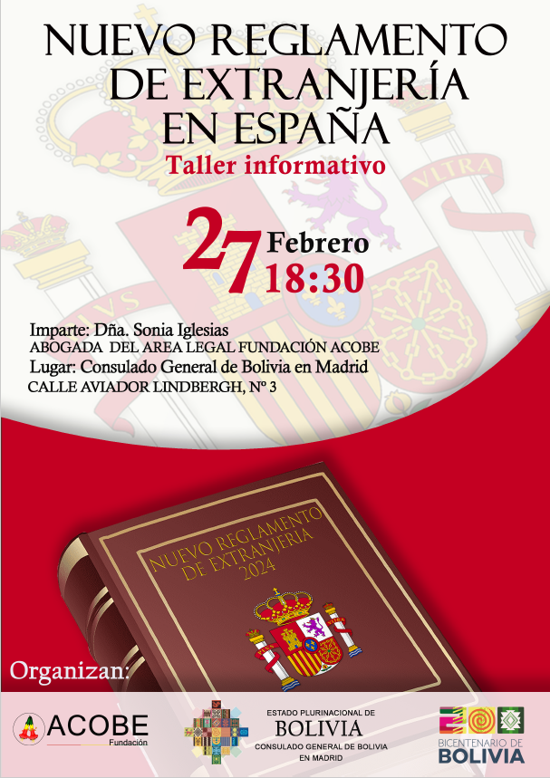 🇧🇴 🇪🇸 INVITACIÓN Se invita a la Comunidad boliviana residente en Madrid al Taller informativo “NUEVO REGLAMENTO DE EXTRANJERÍA EN ESPAÑA”, impartido …