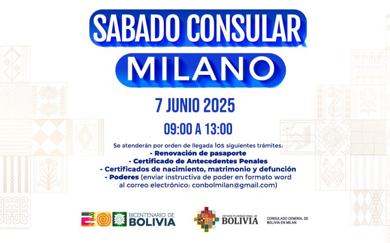 El Consulado General del Estado Plurinacional de Bolivia en Milán informa a la comunidad boliviana residente en el norte de Italia que se llevará a cabo una nueva jornada de atención consular el día sábado 7 de junio de 2025, con el objetivo de facilitar la realización de diversos trámites a las y los ciudadanos bolivianos.